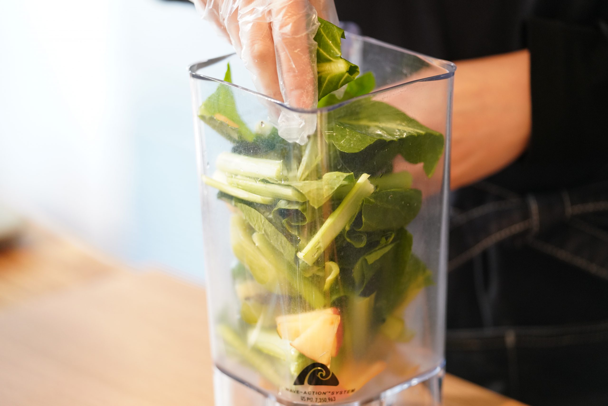 ベースのレタスは、β-カロテン含有量は玉レタスの8倍を超え、カルシウム・ビタミンKは約3倍、カリウムは約2倍、葉酸は約1.5倍の栄養価の高いグリーンカールを使用しています。野菜の洗浄はピュアスター水(微酸性電解水)を使用し、塩素臭のない野菜本来の味を楽しめます。