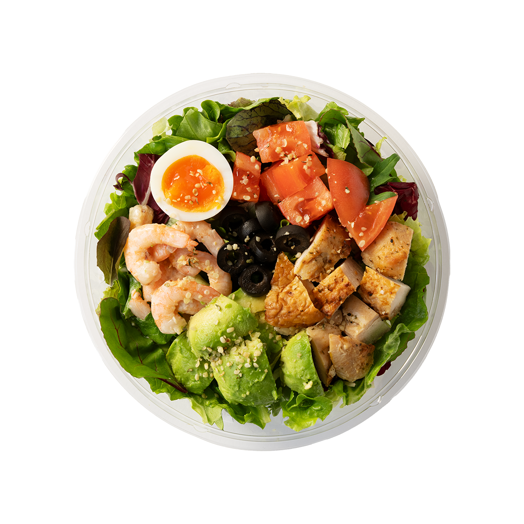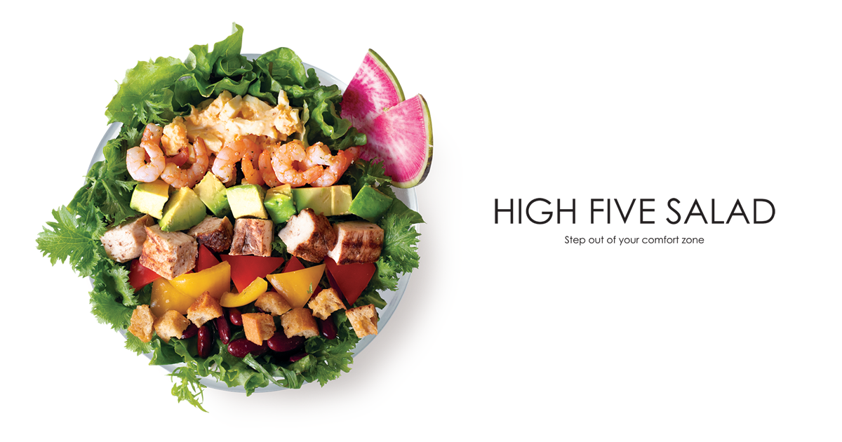 こだわりのローストチキンやトマト、えび、アボカドなど10種類の食材がトッピングされており、様々なおいしさが味わえます。店頭でも人気No.1のHIGH FIVE SALADを代表するパワーサラダです。