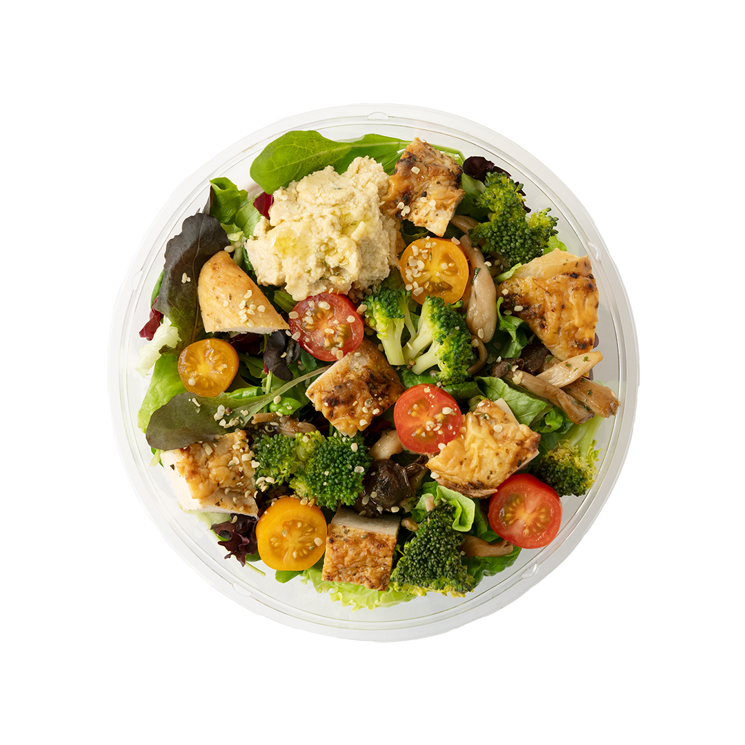 丁寧にマリネしじっくりローストしたしっとりチキンに、キノコソテーのうま味と香りがサラダの美味しさをひきたてます。ひよこ豆と白ごまペーストを使用したフムスは中東諸国で愛されている料理で、癖になる味わいです。
