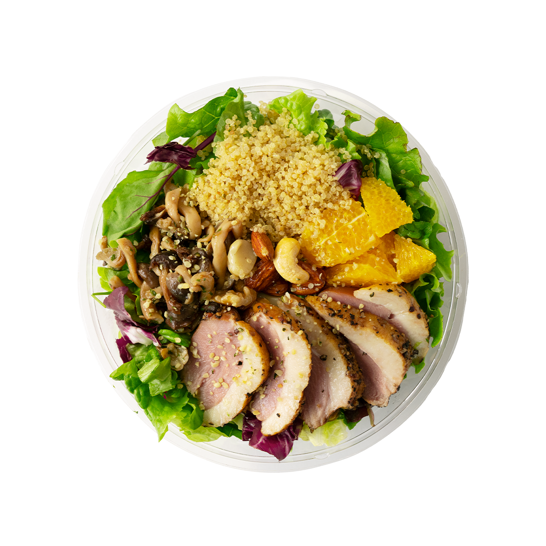 ジューシーな合鴨にしっかりとパストラミが効いており、オレンジの酸味やハニーナッツの甘みが絶妙な相性です。 タンパク質やビタミンB群がいっぱいのスーパーフード、キヌアはクセのないプチプチとした食感が楽しめます。