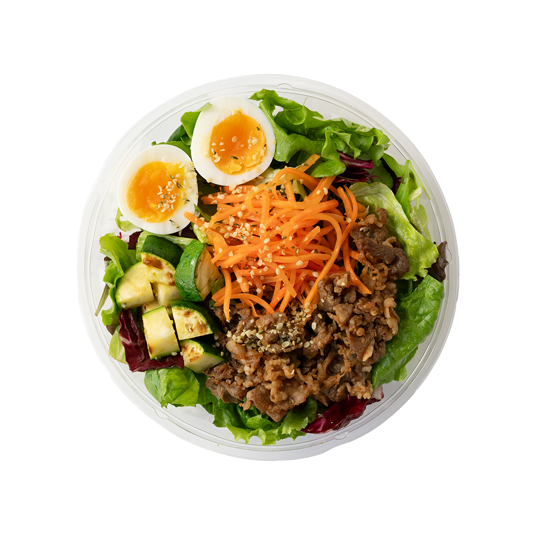 ピリ辛の牛カルビにとろーりたまごとにんじんラぺ、低カロリーでヘルシーなズッキーニを合わせています。辛じょっぱい味にさっぱり甘いラぺの相性は最高です。