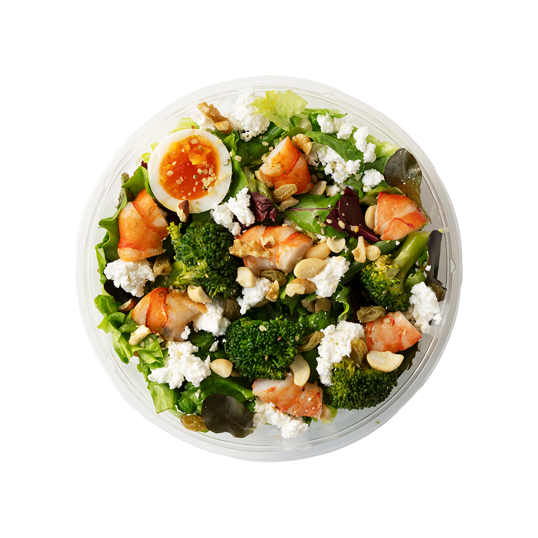 良質な動物性たんぱく質が豊富な、ぷりぷり食感が人気のガーリックシュリンプを、たまごやブロッコリーと合わせることで更に高たんぱくなサラダに仕上げています。白くて柔らかなフレッシュチーズでさっぱり、彩りも華やかに。